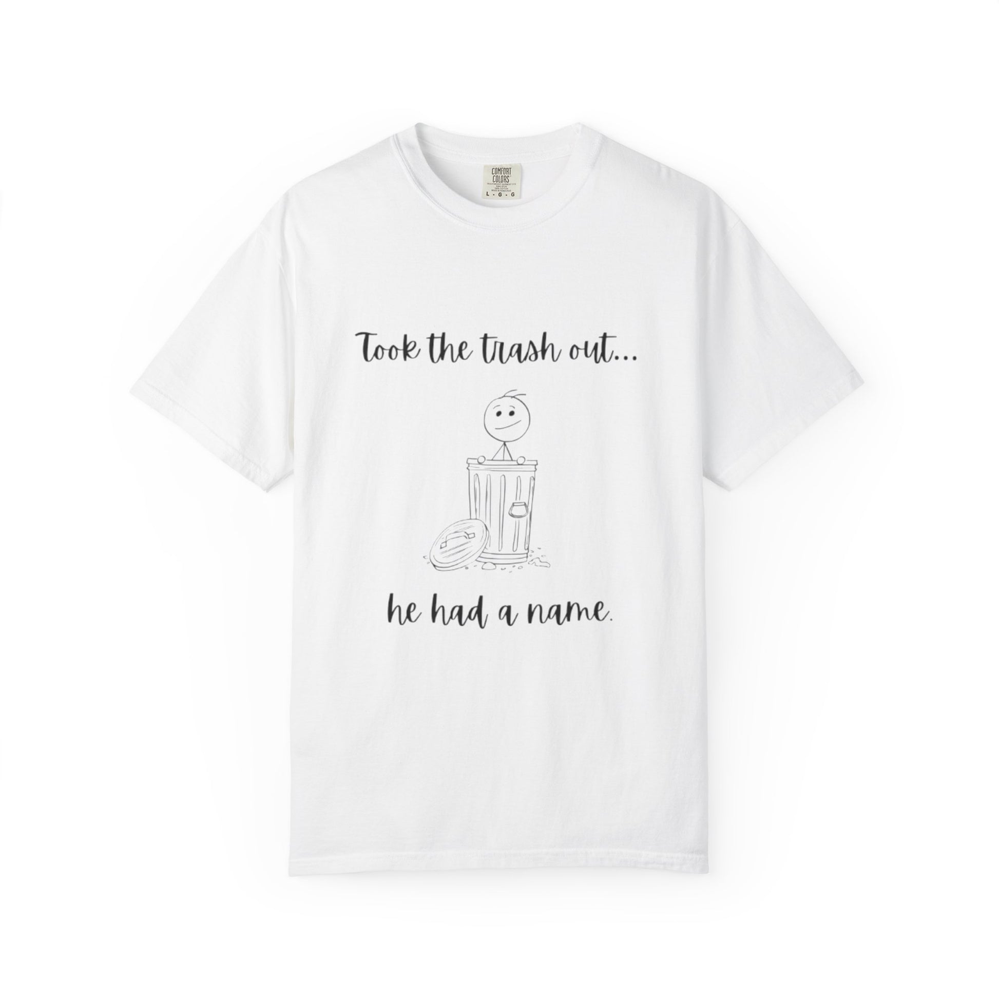 Comforting shirt designed for women after a breakup, with the text 'Took out the trash he had a name'. Perfect for women going through a tough time and looking for a humorous way to deal with it. Ideal for wearing at home or out with friends. Relevant for occasions like breakup parties or girl's night out.